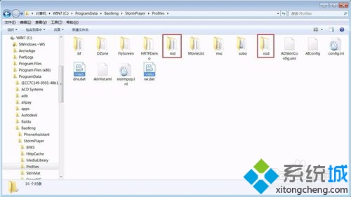 6、再介绍一下去掉播放视频前的方法:WIN7系统用户进入“C:\ProgramData\Baofeng \StormPlayer\Profiles”然后删除vod和md文件夹;