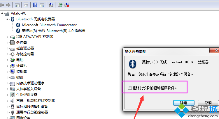 2、右击蓝牙设备选择卸载,勾选“删除此设备的驱动程序”,后点击确定卸载;