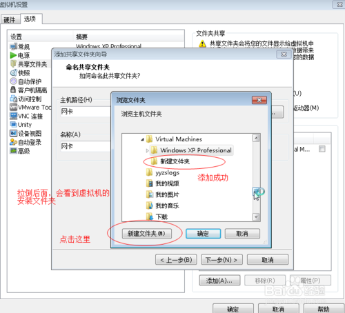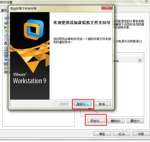 5:然后单击添加按钮,添加之后就可以选择你的主机(win7)中的文件路径。然后单击继续,确定即可,我的之前添加过了这里就不在演示了。