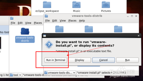 打开刚刚解压的文件路径,打开,然后找到刚刚解压的文件的文件夹——找到vmware——install.pl.文件,双击后如图。选择第一个,即可,等待一下,即可完成安装。